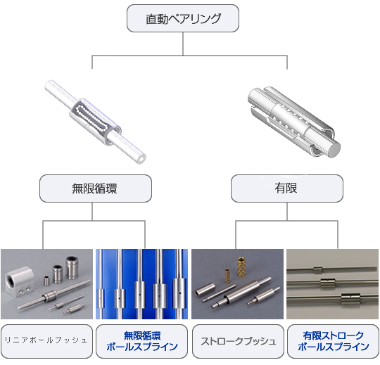 ボールスプラインは直動ベアリングのひとつで、ストロークに制限のある有限タイプと制限の無いの無限循環タイプがあります。