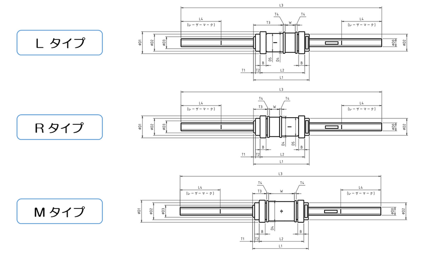 L3 | L4 | D2 | D3 | D4 | D5 | T1 | T2 | T3 | T4 | 回転ベアリング | タイミングプーリ仕様 | |||||