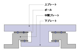 各プレートの間に多数のボールが配置され、スムーズな平面転がり運動を可能にしています。